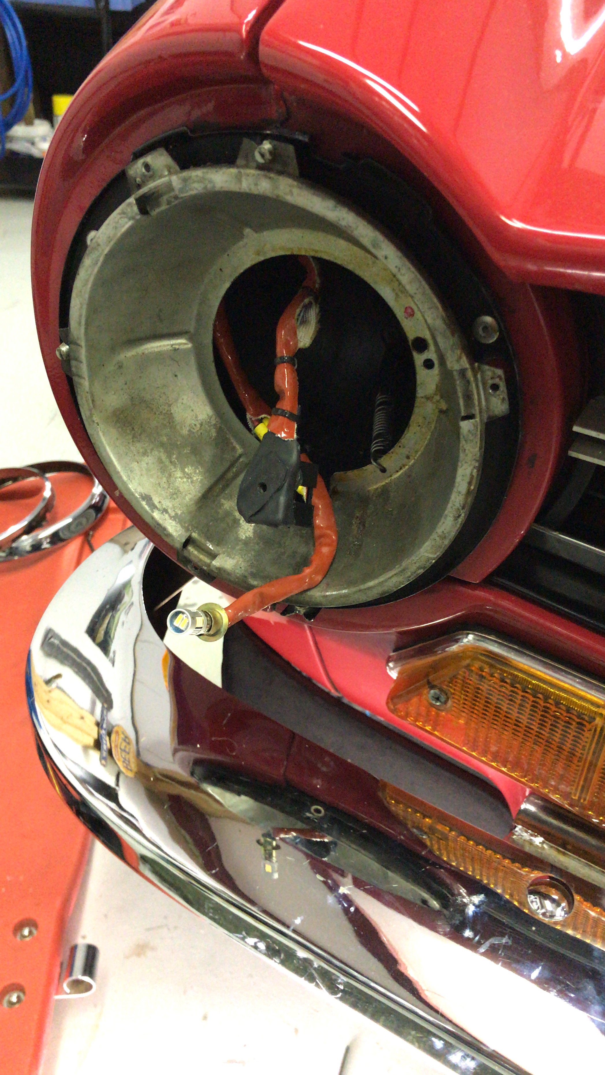 Bij mijn TR6 (USA) zijn de knipperlichten aan de voorzijde, boven de bumper, als een gecombineerd knipper-/stadslicht 3). Voor die laatste gebruik ik een 12V 21/5W led in 2 kleuren: 21W is oranje en 5W is wit. (BAY15D). Dus het stadslicht brandt wit en als de richtingaanwijzer wordt geactiveerd, komt de 21W oranje kleur erbij.