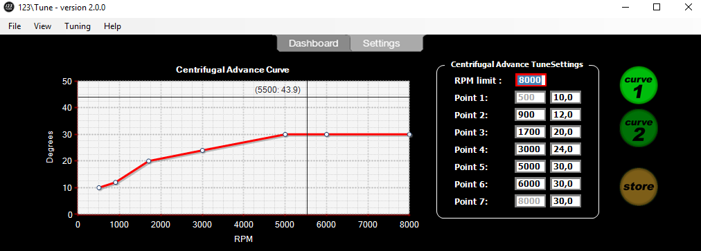 Als eerste zetten we de centrifugaalvervroeging gegevens in de 123-ontstekingssoftware.