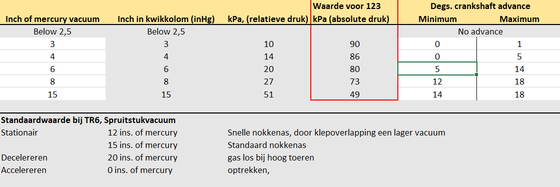- de vacuümvervroeging (advance) een handig hulpmiddel is, omdat er bij een hoog vacuüm in verhouding een arm mengsel is dat meer tijd nodig heeft om te ontsteken. Daarom wil je op dat moment de ontsteking (nog meer) kunnen vervroegen.
