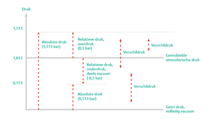 We spreken over relatieve druk als dit wordt gemeten vanaf de atmosferische druk. Bij absolute druk wordt de druk gemeten vanaf 0 Bar waarbij 0 Bar ook bekend is als vacuüm.