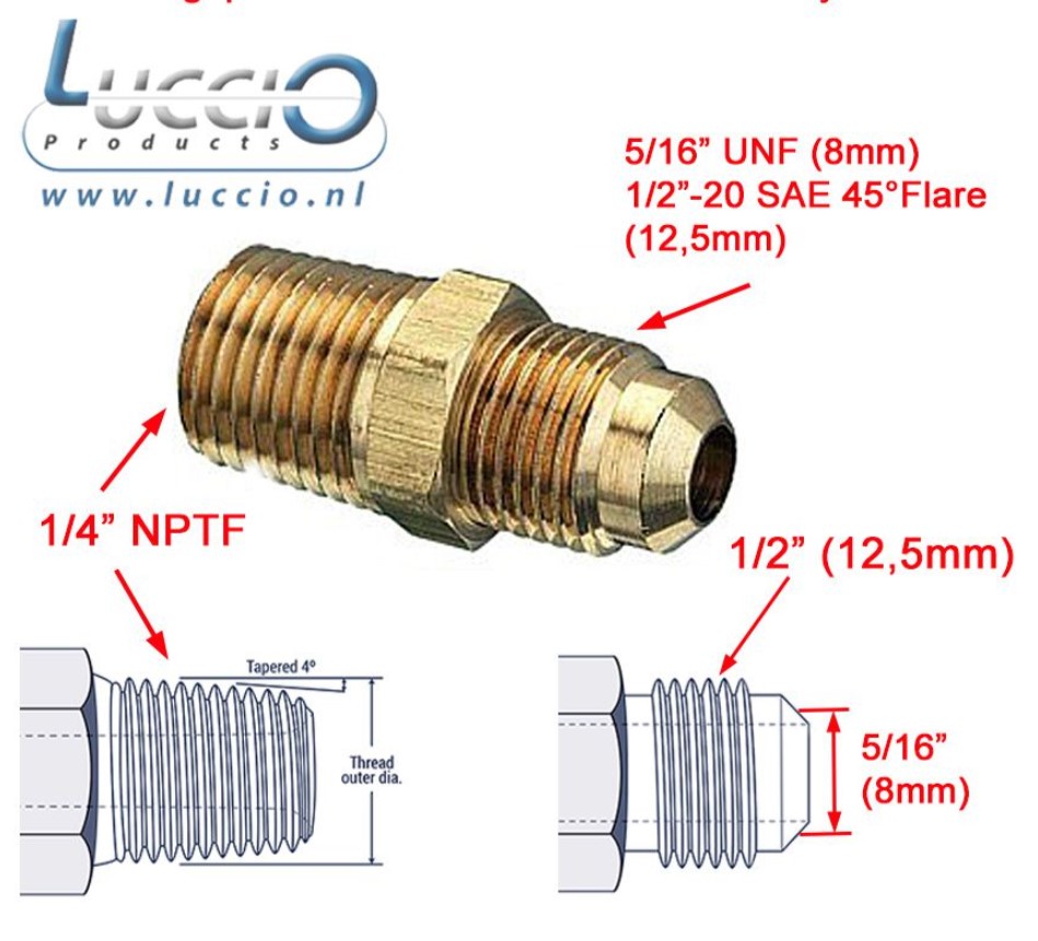 Aan 1 zijde sluiten we een 8mm benzineslang aan. Omdat te doen hebben we dus een verloop nodig van 1/4” NPT naar 8mm slangaansluiting. Op Napa autoparts vinden we de juiste fitting, namelijk 1/4“NPT male naar 5/16 (8mm) slangaansluiting