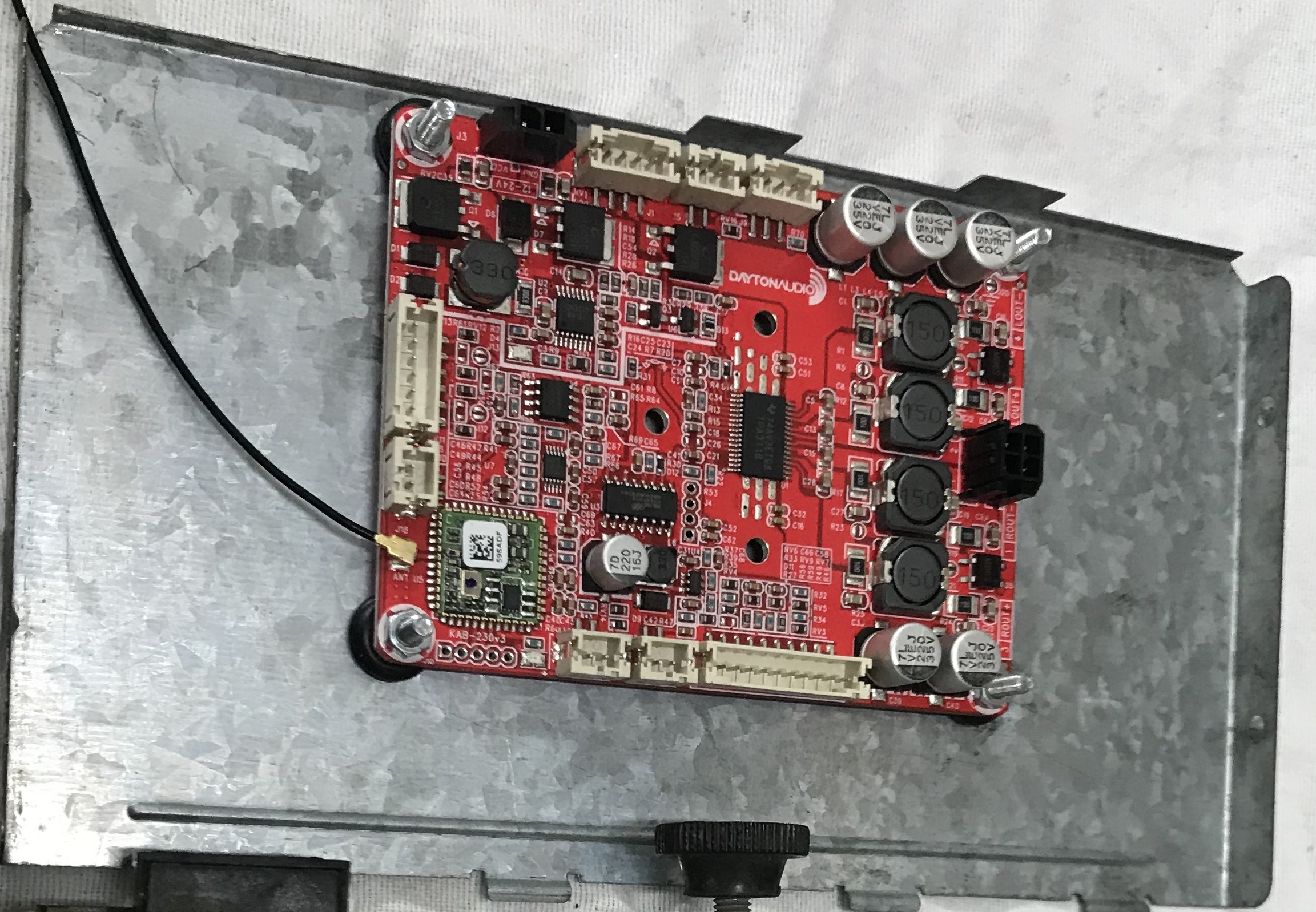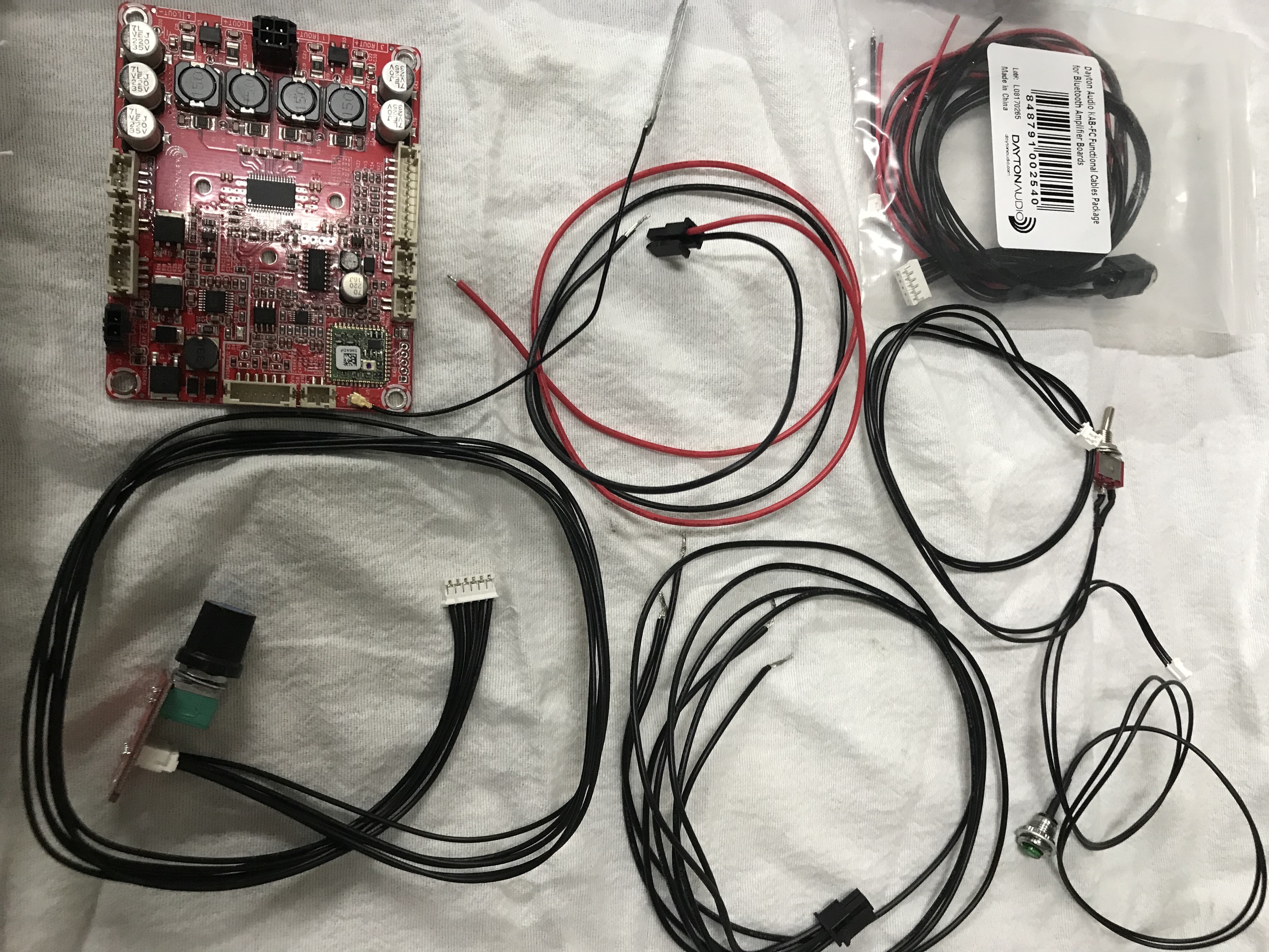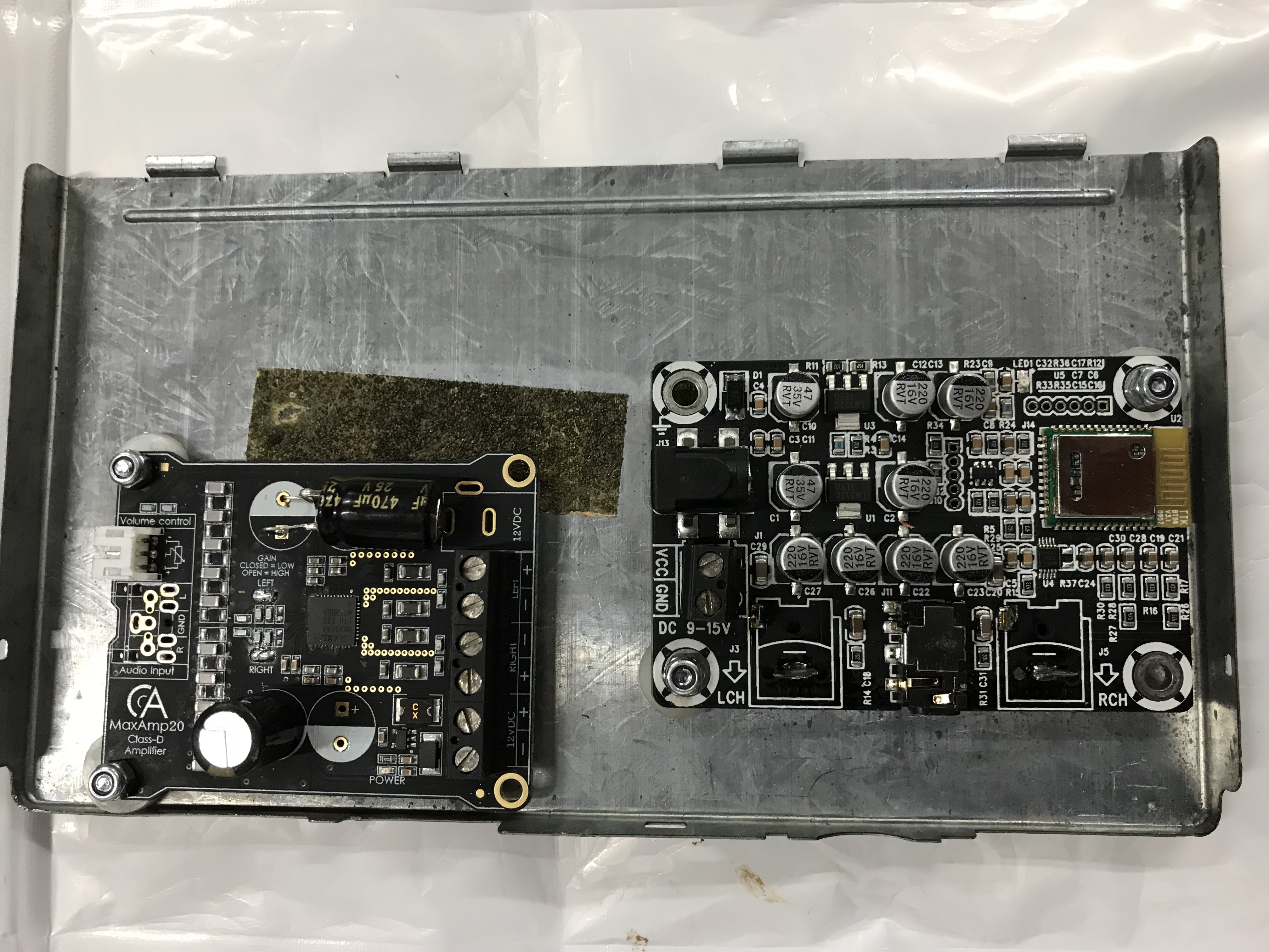 - 1x versterker print, Class-D chip met 20W vermogen per kanaal.