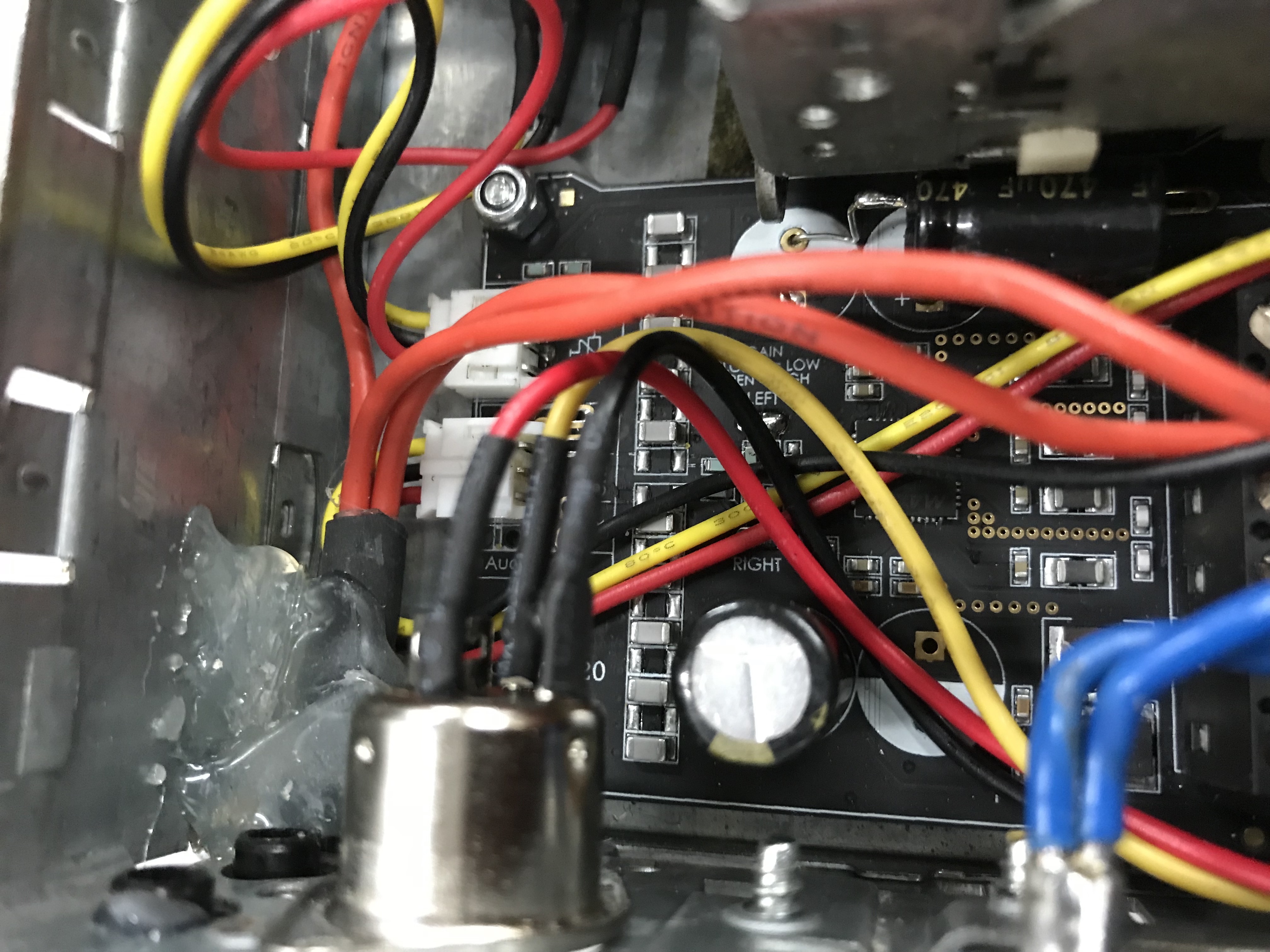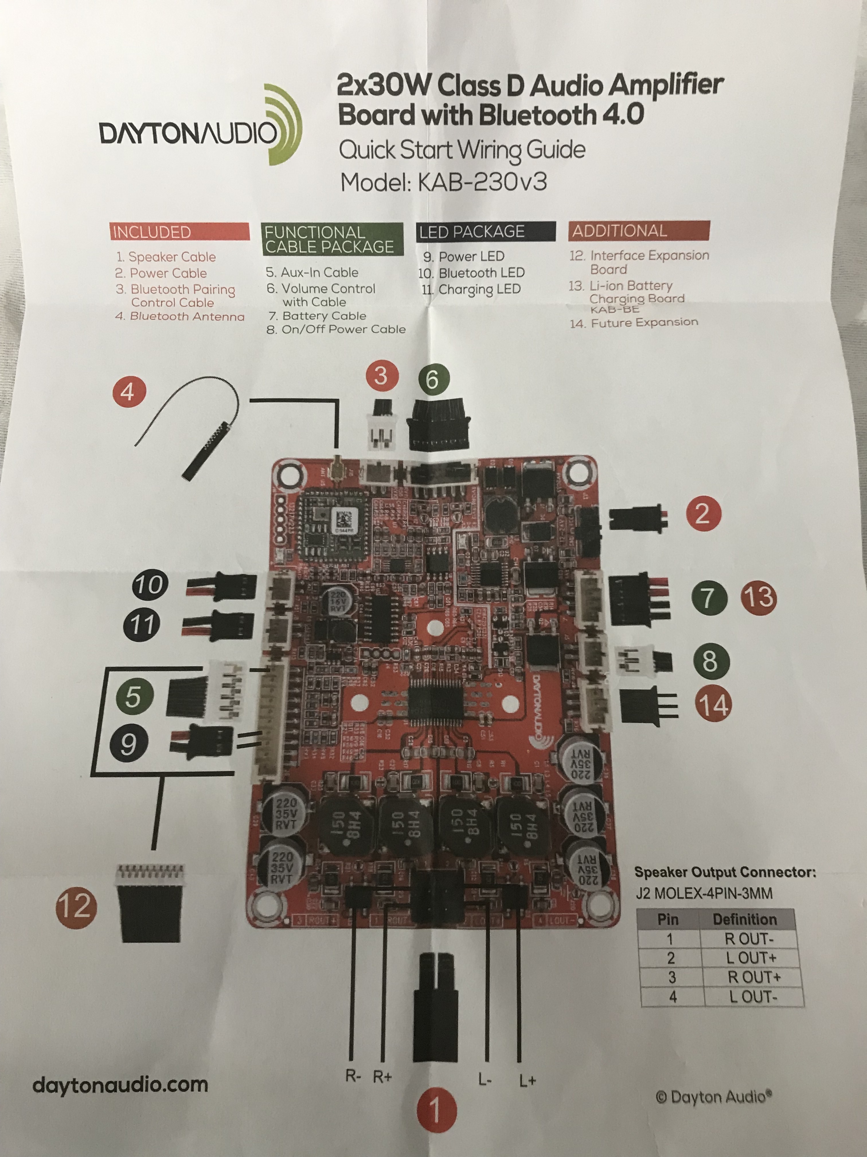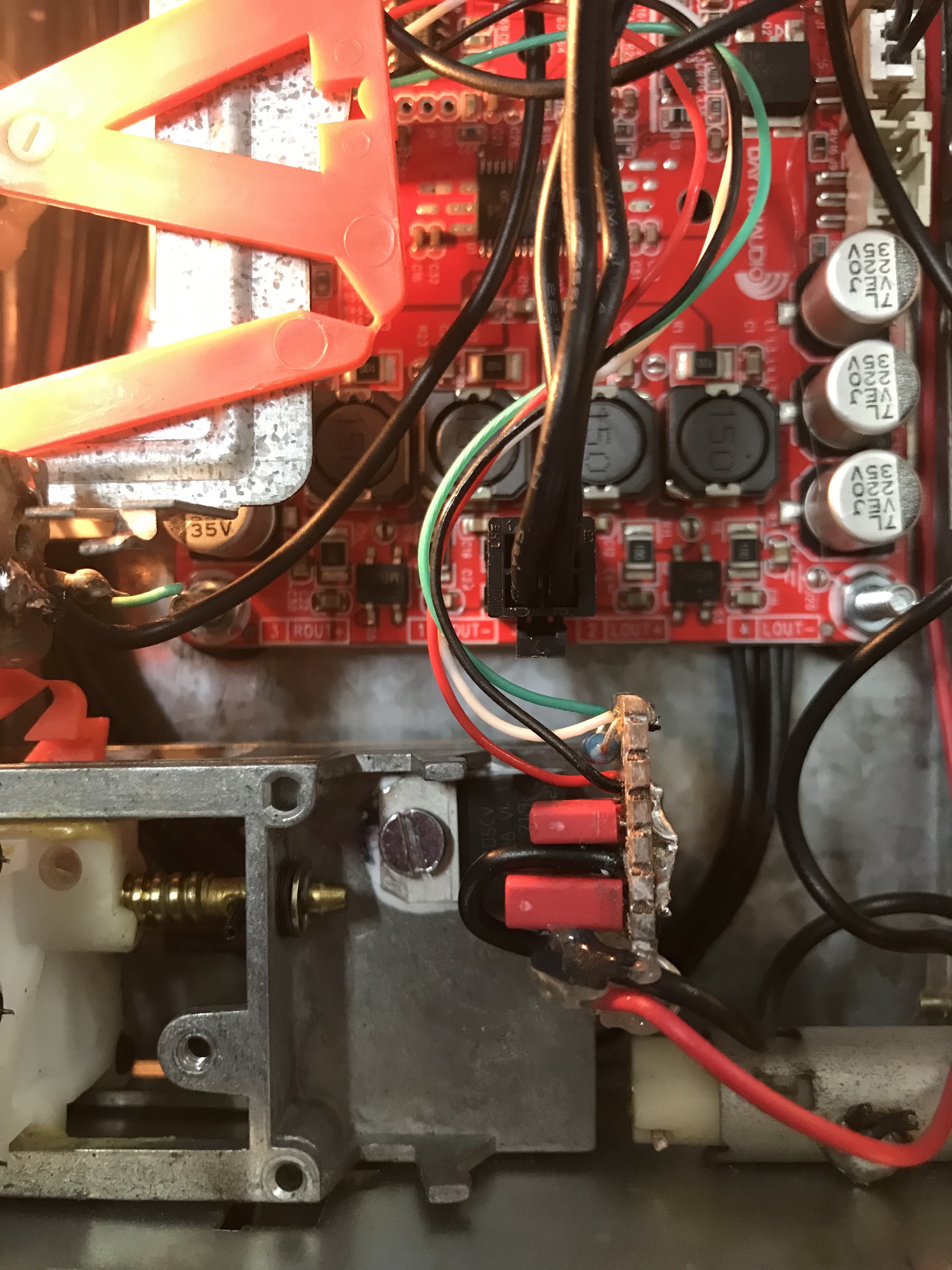 - 1x versterker print, Class-D chip met 20W vermogen per kanaal.
