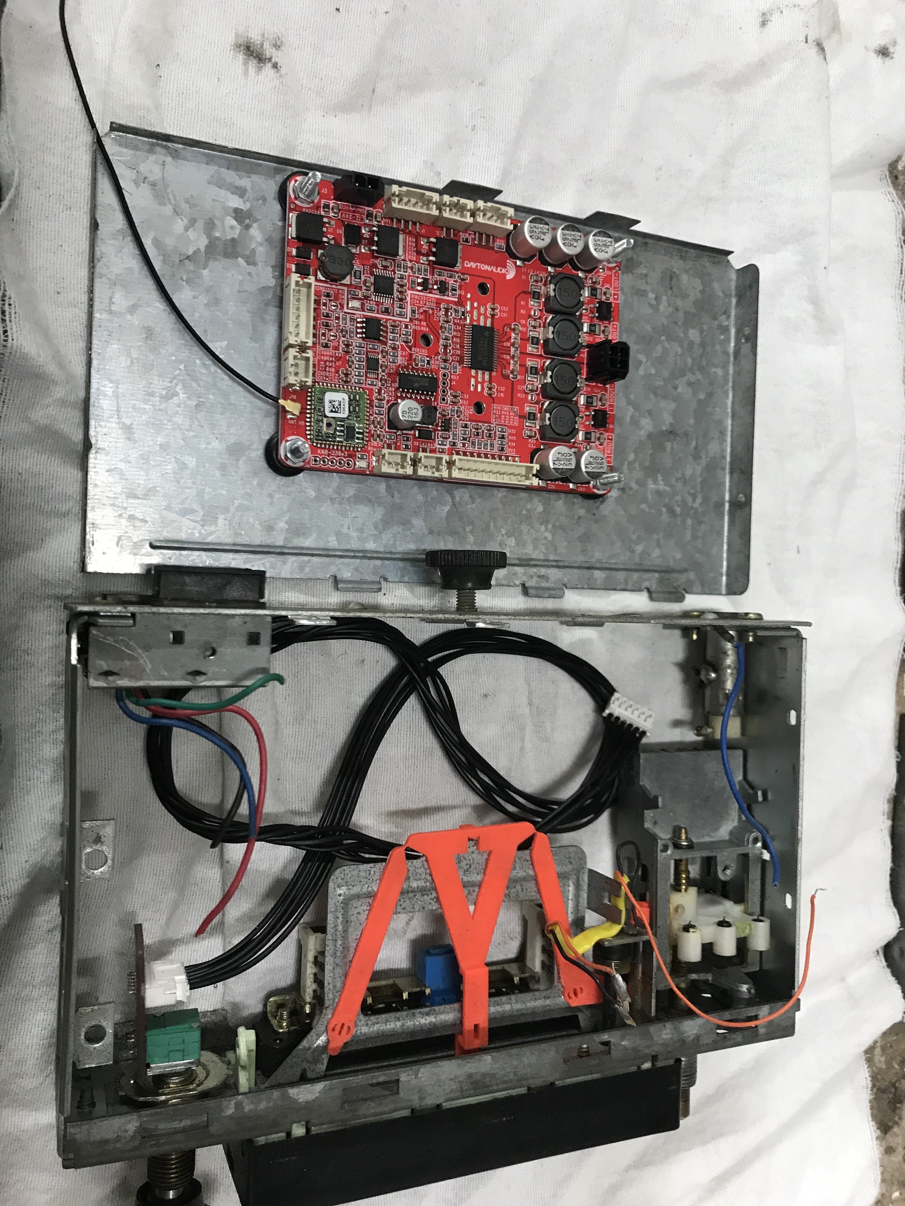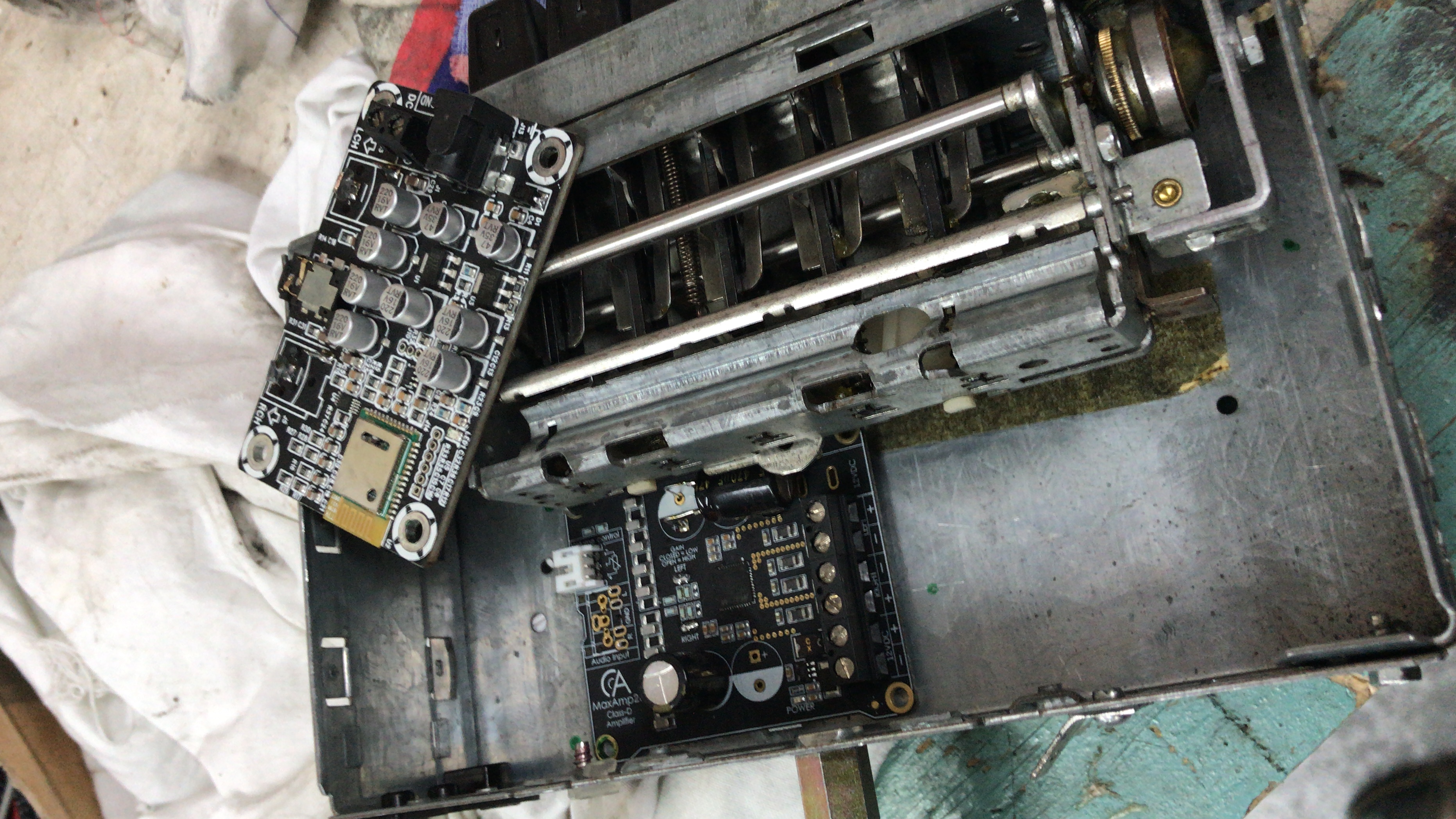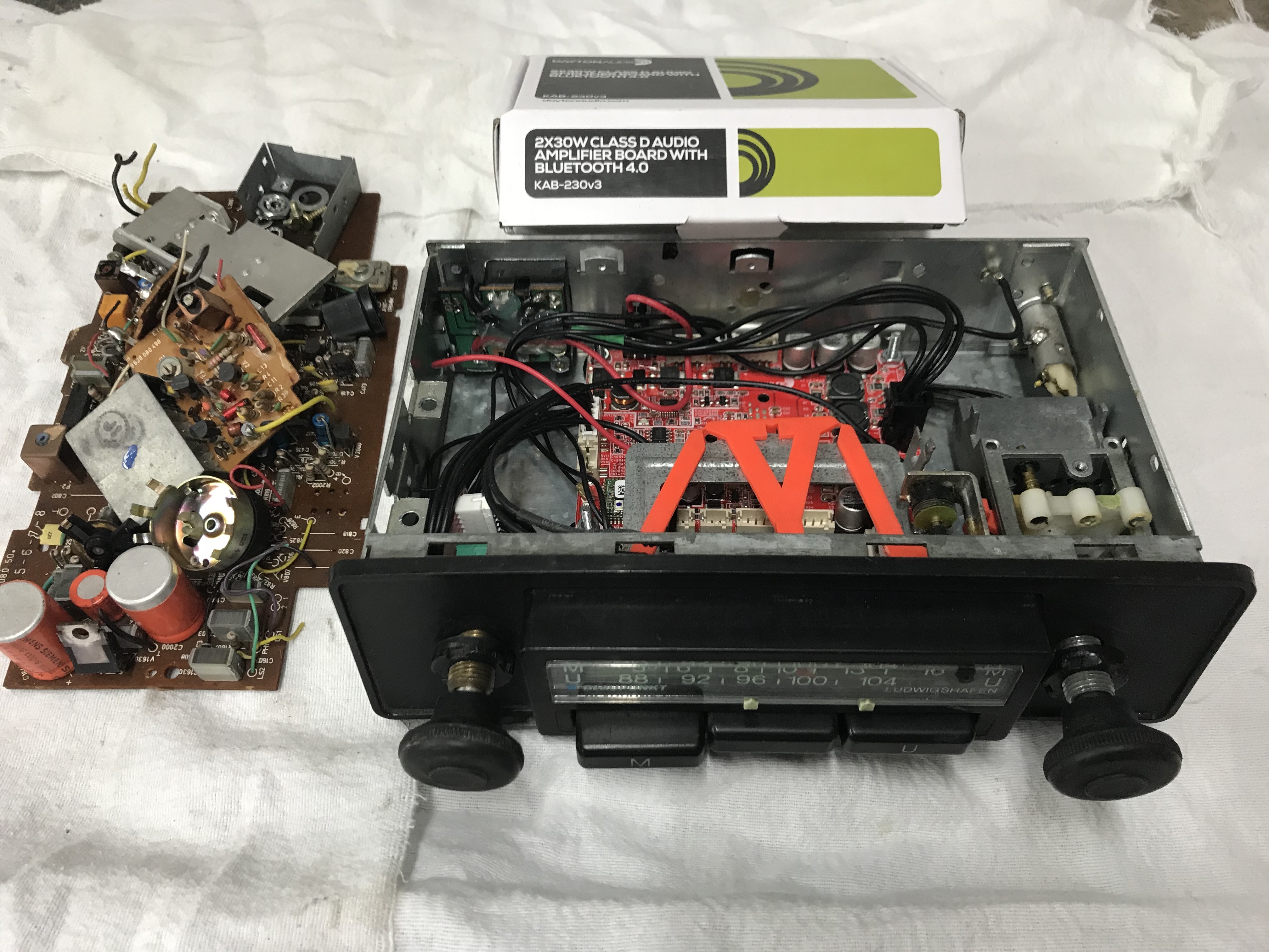 Er zijn diverse soorten losse versterkers te koop op internet. Hier nog een fotoverslag waarbij een Blaupunkt type Münster (1972) is omgebouwd. Deze radio is met 2 losse printen omgebouwd en voorzien van een USB aansluiting voor het opladen van een telefoon, max 2A.