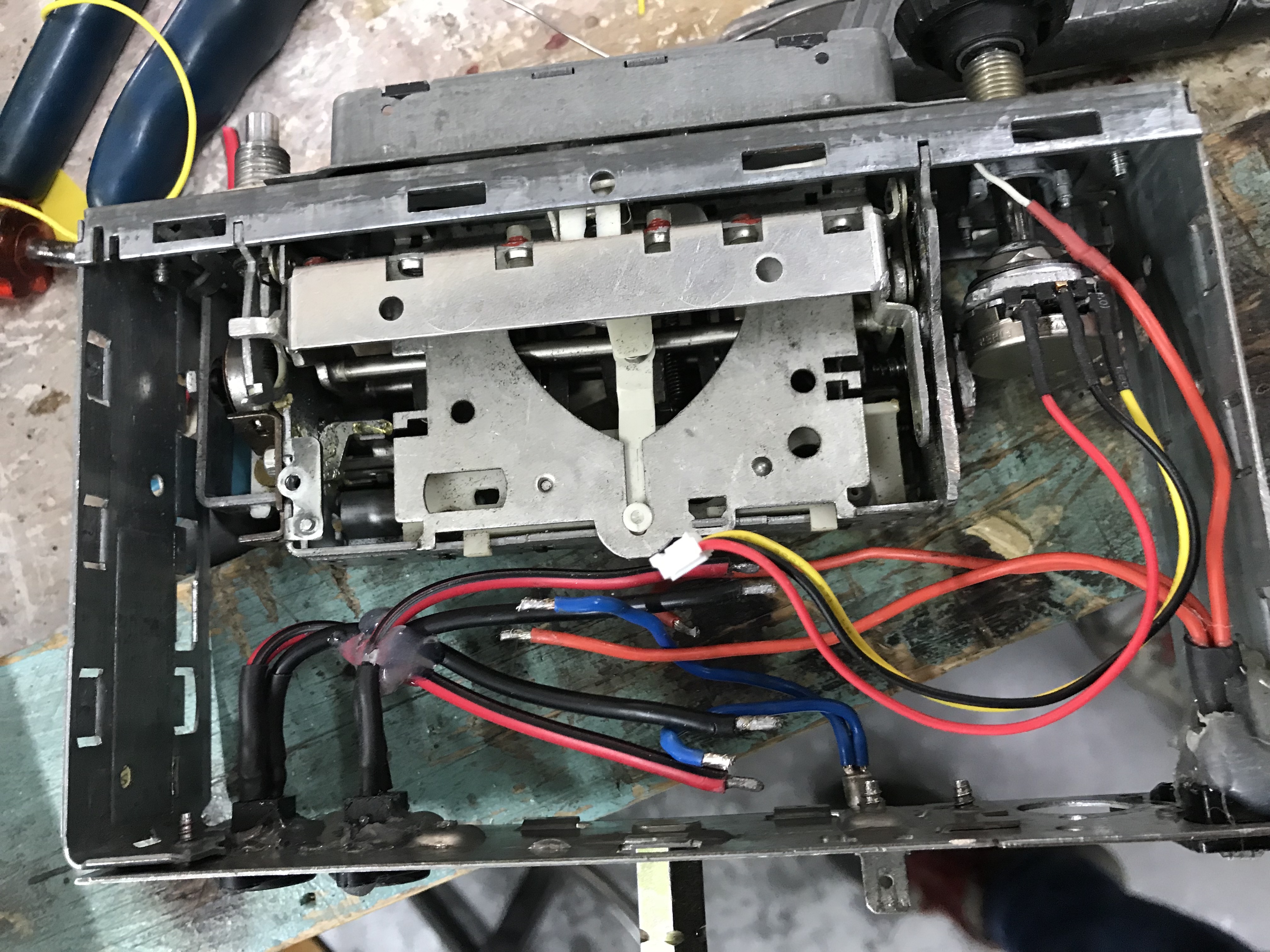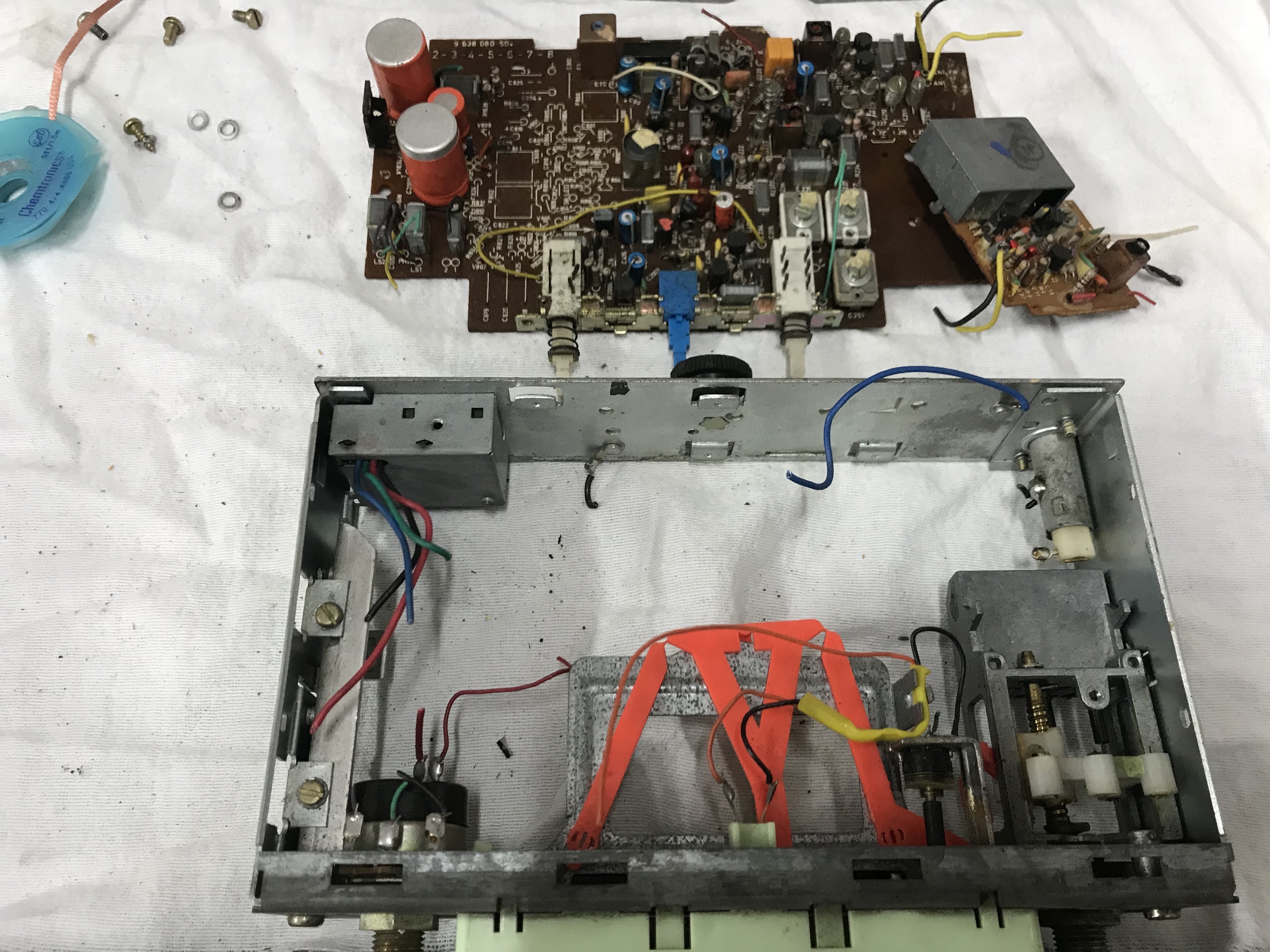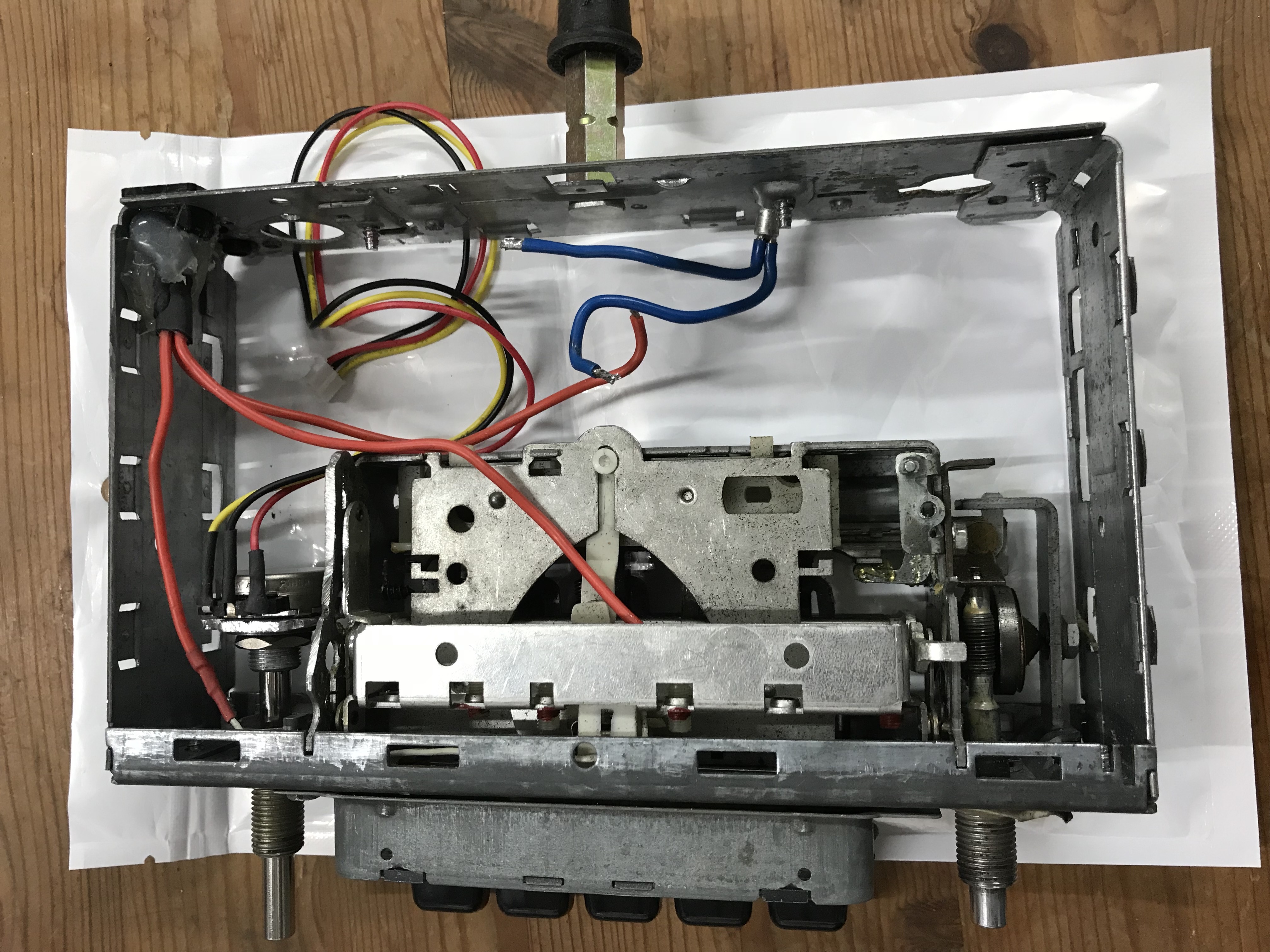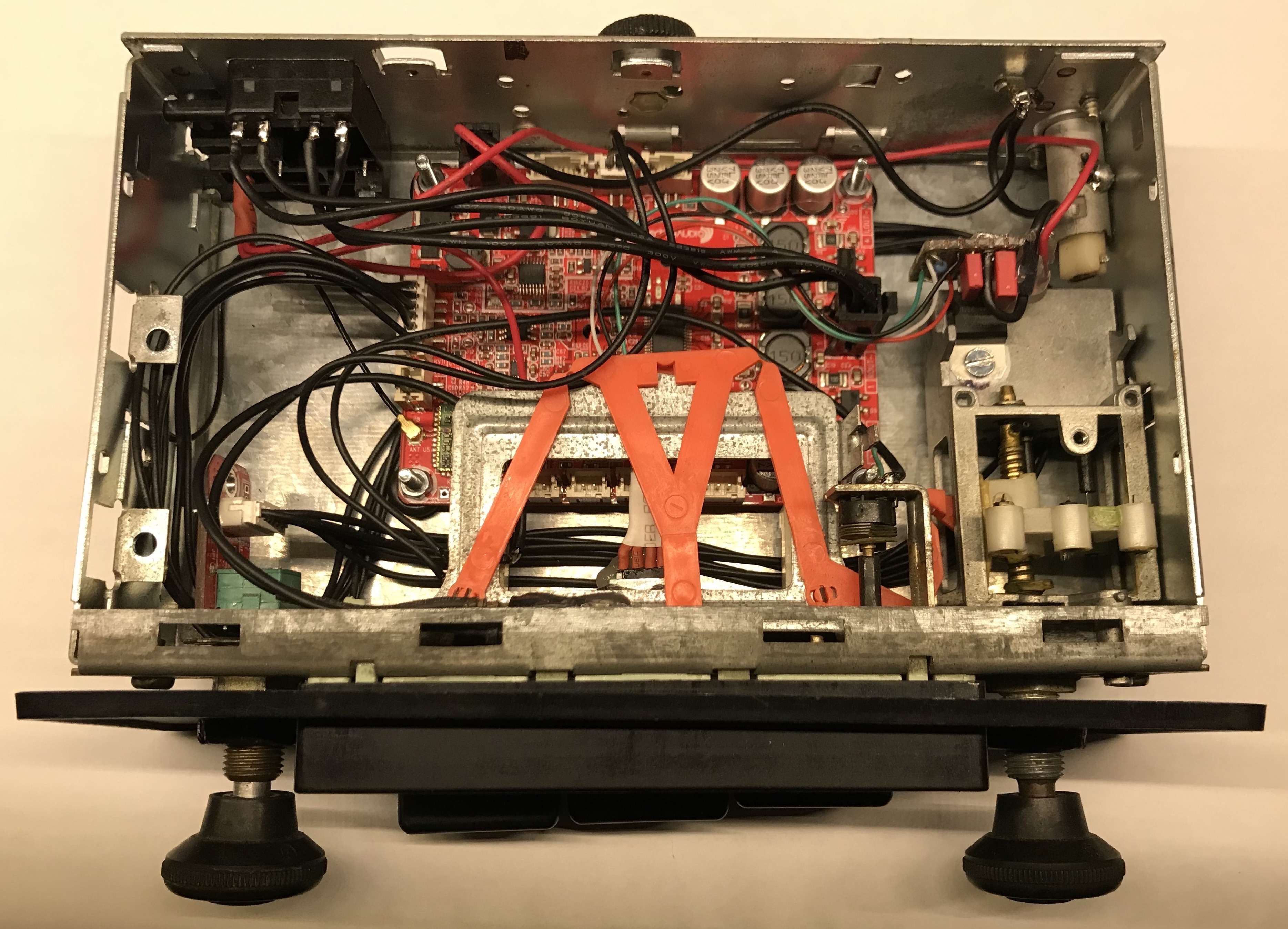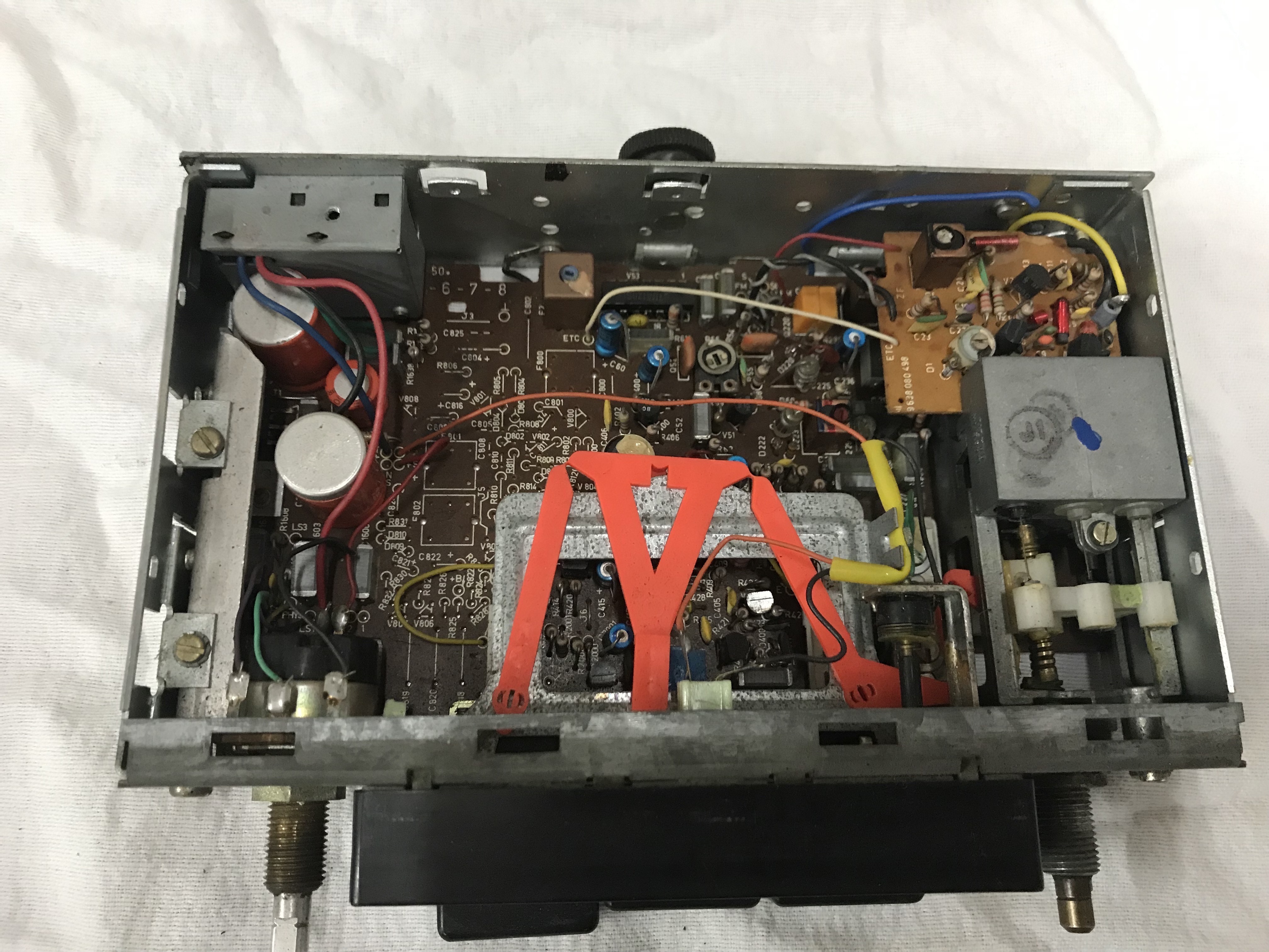 Dan is de eerste uitdaging om de radio leeg te halen, dus de-solderen en alles voorzichtig verwijderen. Wij behouden de knoppen, het systeem om de zendernaald te verdraaien en alle originele aansluitingen aan de achterzijde. Hiervan krijgen een aantal een andere functie.