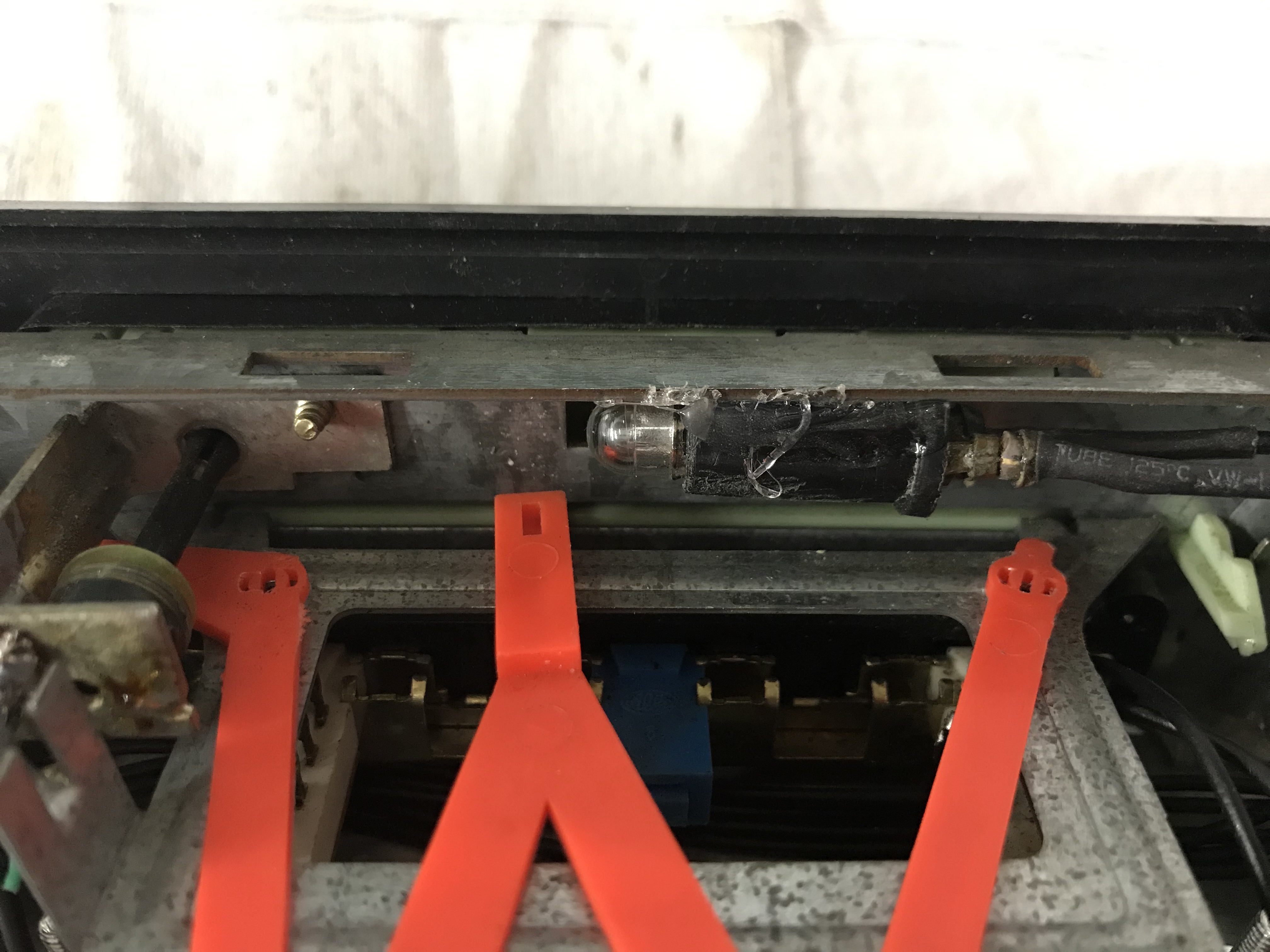 De schakelaar die achter de zenderkeuze knop -M- zit is 2 polig. Deze schakelaar wordt hergebruikt voor het in standby zetten van de versterker die we gaan inbouwen en het aan/uit schakelen van de radio verlichting, die wij tevens ombouwen naar LED.
