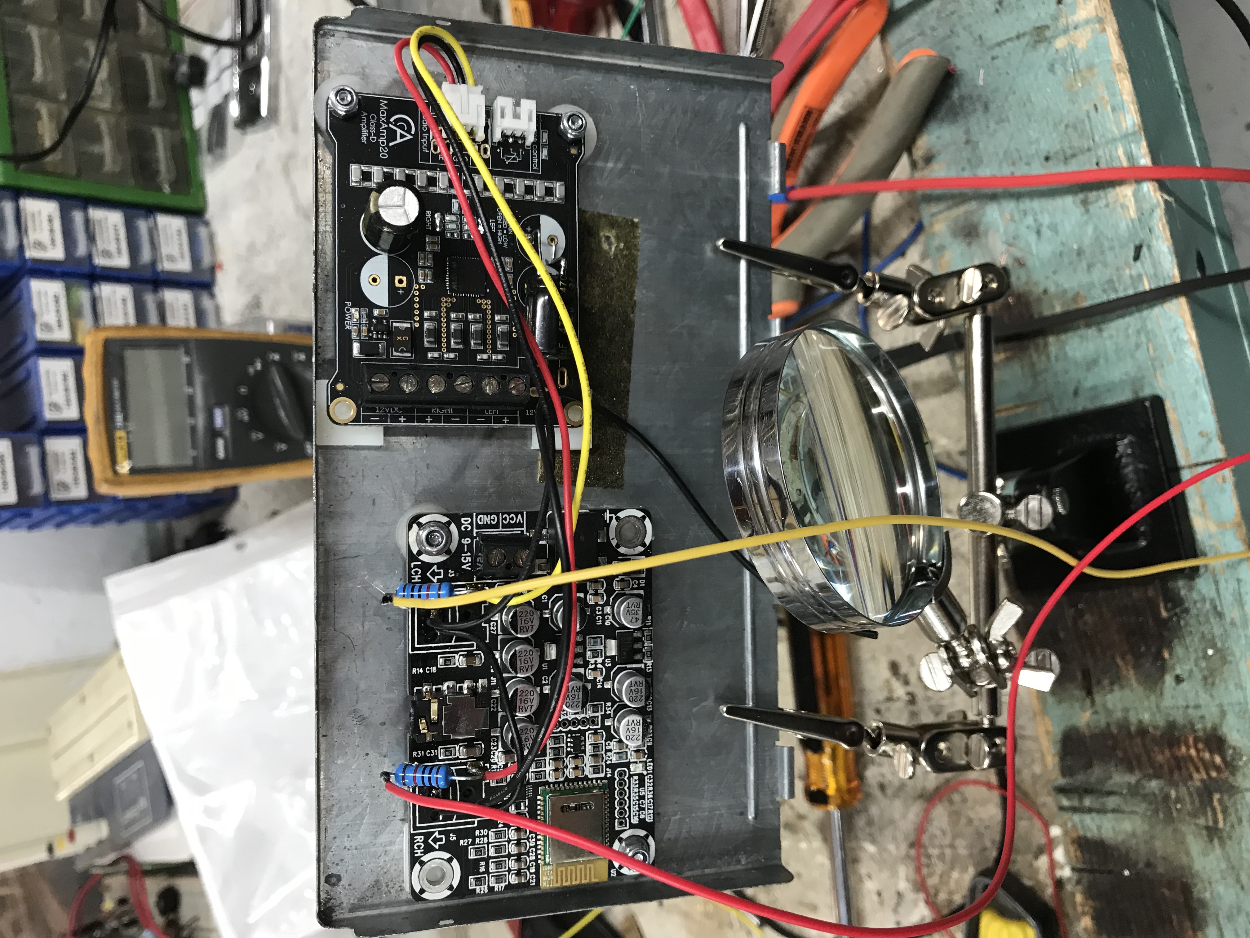 Het inbouwen van de versterker, 2x 30W met geïntegreerde bluetooth 4.0, is geen probleem. Print past ruim op één van de deksels.