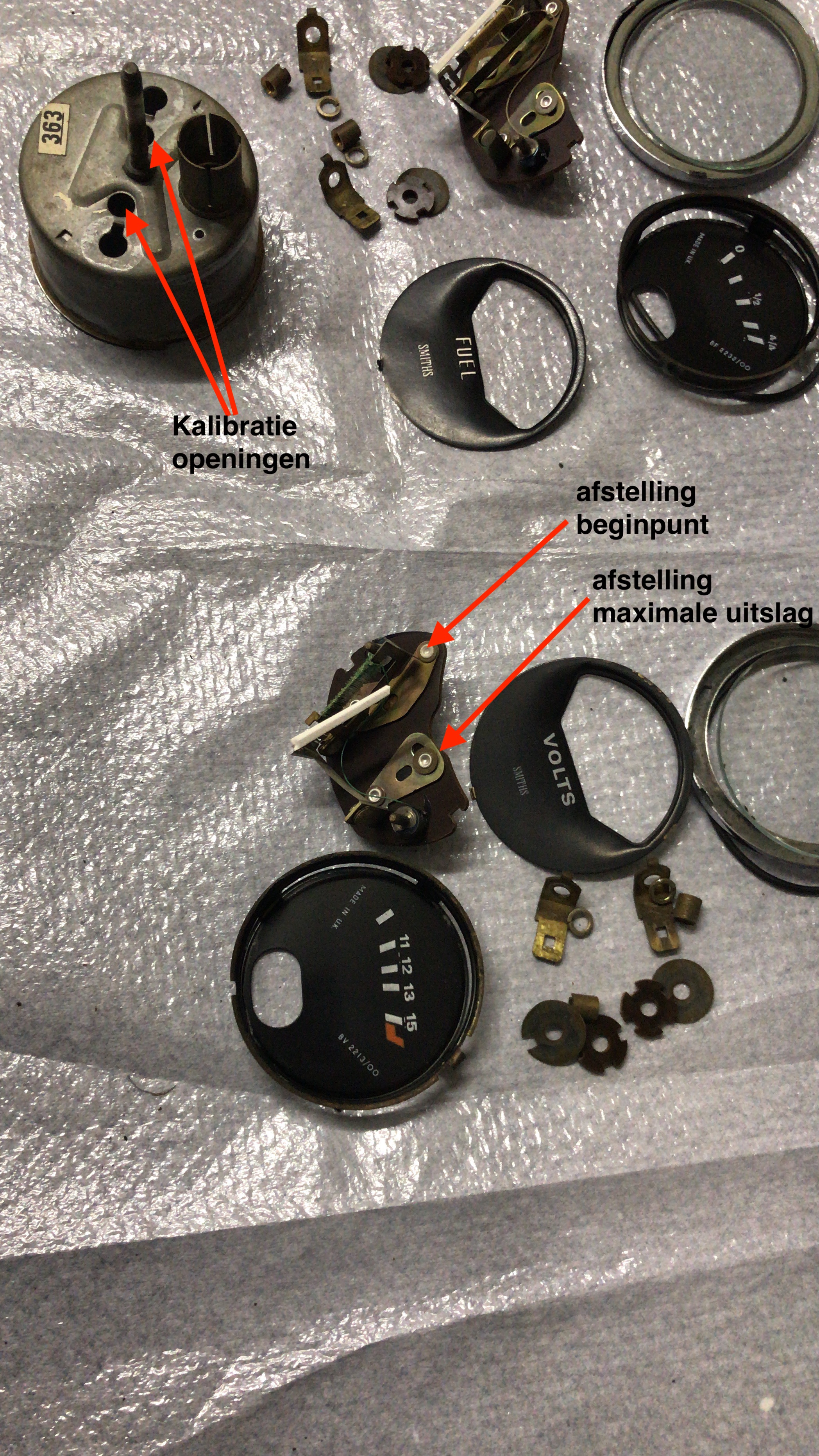 Als we nu naar de achterkant van de meters kijken, zien we twee openingen, (deze kunnen bedekt zijn door kurken pluggen) in die openingen past een kalibratietool. Probeer de afstelling niet te doen met een schroevedraaier.