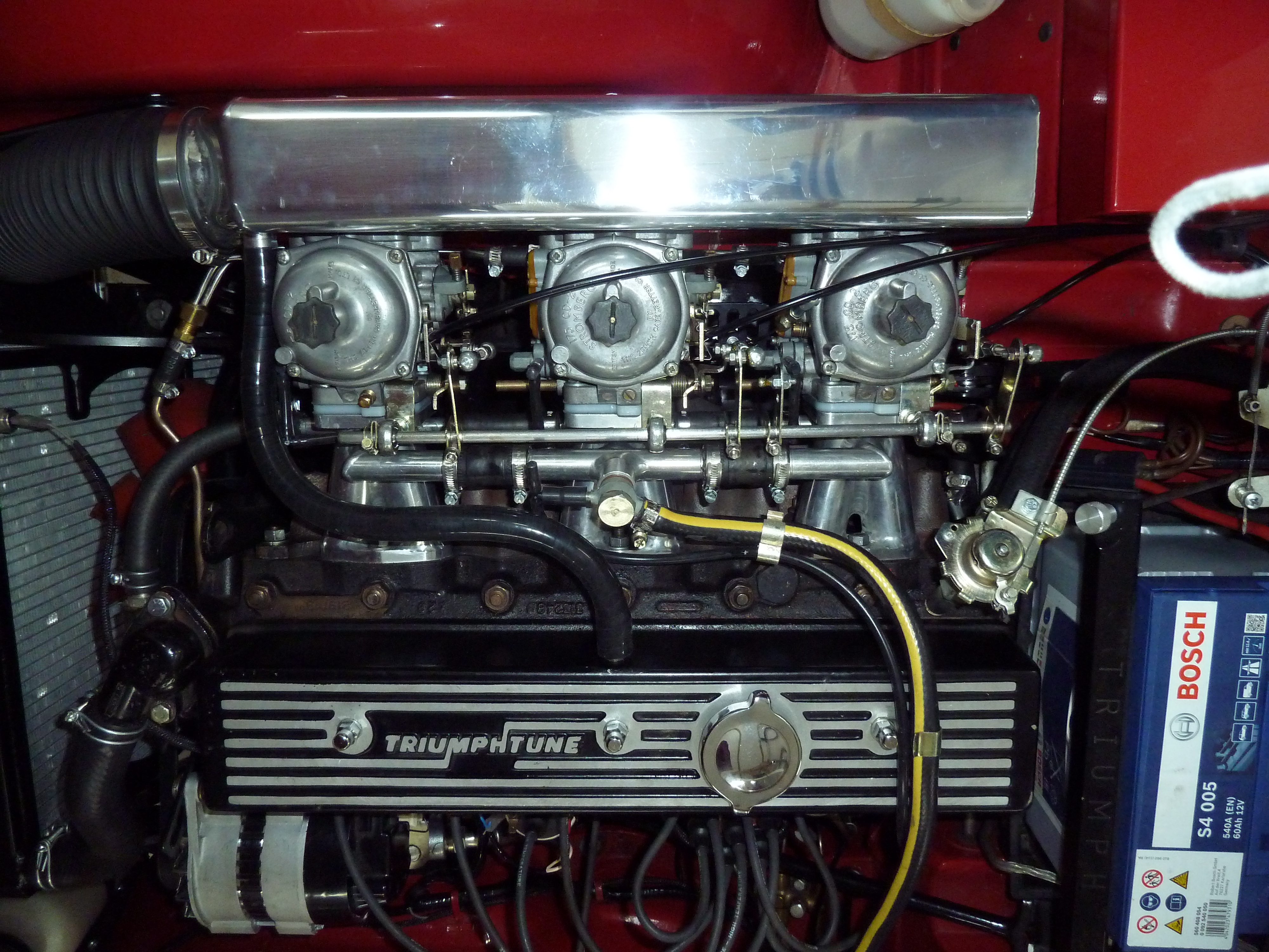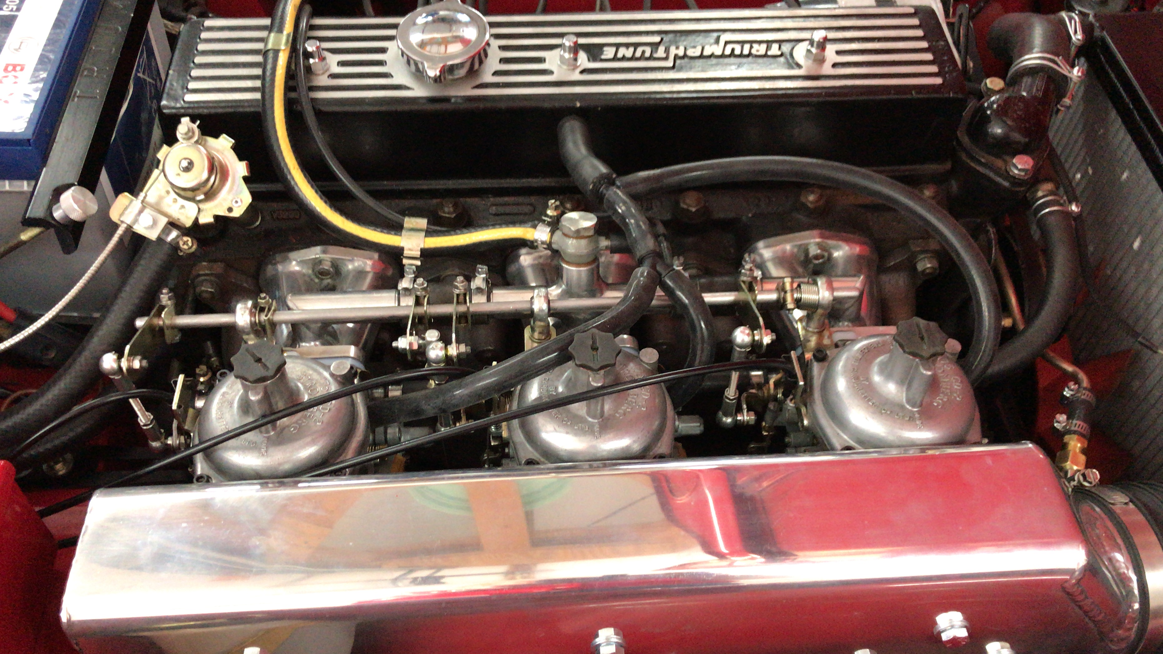 De ombouw naar 3 Stromberg carburateurs 175CD2. De 2 originele carburateurs zijn hergebruikt.