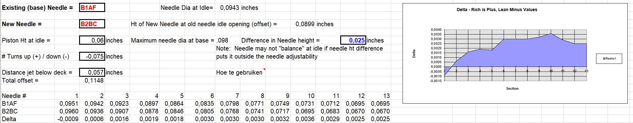 Download hier7) een overzicht van de verschillende naalden en maak een vergelijk t.o.v het type dat is gemonteerd. In het diagram kan men zien in welk gebied de naald meer of juist minder benzine doorlaat.