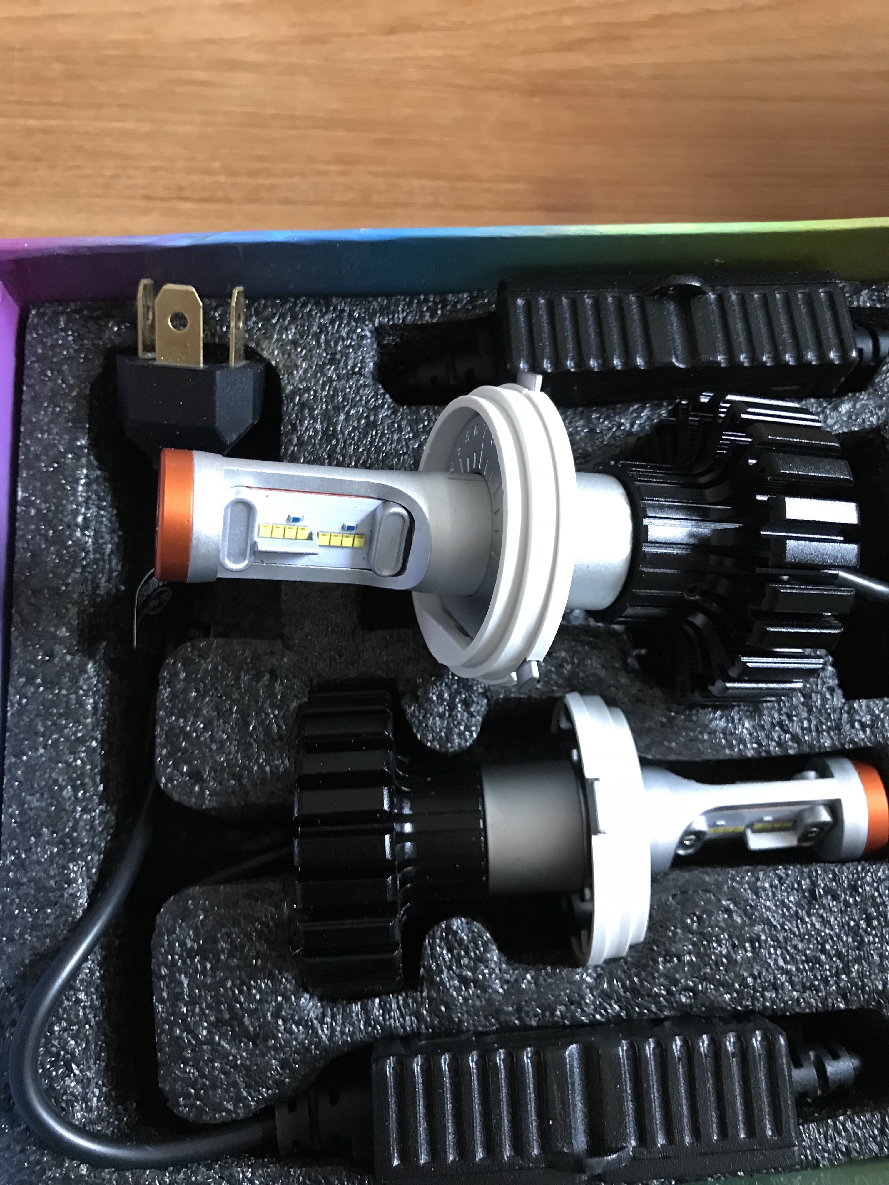 De LED koplampen hebben een controlunit om te zorgen dat ze netjes gelijkmatig branden, en een koelelement! aan de achterzijde. Alles past keurig achter de reflector in de behuizing, maar een kleine aanpassing is nodig om te voorkomen dat er sluiting komt of dat bedrading te heet wordt.