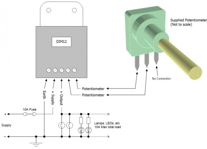 Een via een potmeter 2) geregelde dimmer waarbij de output positief (plus) is. De bijbehorende potmeter, waarde 10K lineair, is ook op de website te koop en hiermee is de set compleet.